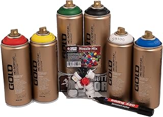Sprühdosen Montana Gold Grundfarben + schwarz & weiss + Ersatzsprühköpfe + Edding permanent Marker für Hobby Handwerk Graffiti Acryllack zum Lackieren und Dekorieren von Glas, Metall, Holz, Leinwand