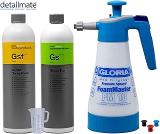 detailmate Aktivschaum Prewash Set: Gloria FM10 Schaumsprüher Foam Master 1L+ Koch Chemie Gentle Snow Foam 1L / Green Star Universalreiniger 1L + 50 ml Messbecher